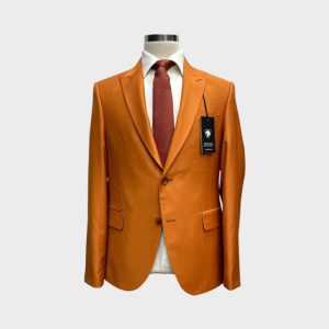 burnt orange suit, bold men’s fashion, contemporary 2-piece suit, standout formal wear, modern tailored suit, unique men’s style